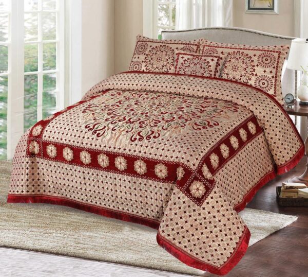 They are available in a variety of designs and colours. This set consists of two cushions, two pillow covers and a beautiful bed sheet. Real Beddings offers quality products for its customers at reasonable prices. Therefore, you can search our products with terms like beddings, luxury bedding, sheets online, best luxury bed sheets, Jacquard velvet bed sheets, and double bedsheet with pillow cover.